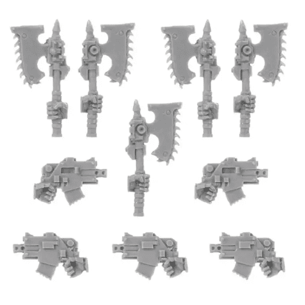 Legion Phobos Chainaxe Set - Less common a sight than the ubiquitous chainsword, the chainaxe was used almost wholesale by the World Eaters Legion, its savage nature and brutal appearance a match for their merciless style of warfare. The Phobos Pattern Chainaxe set contains five Phobos-pattern chainaxes and five bolt pistols. It is fully compatible with our MkII, MkIV, MkV and Legion MkII assault squad models, and is perfect for portraying the ferocious warriors of Angron’s Legion.