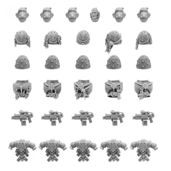 Warhammer 40K Forgeworld Raven Guard Space Marines Upgrade Pack - This set contains highly detailed Raven Guard Mark VI ‘Corvus’ pattern armour helmets, torsos, shoulder plates and backpacks for use in conjunction with the Games Workshop Space Marine plastic infantry kits. The set contains enough parts to make five marines in Mark VI armour in combination with plastics including a Veteran Sergeant, as well as five alternate pattern Sternguard bolters. Plastic components are sold seperately.
