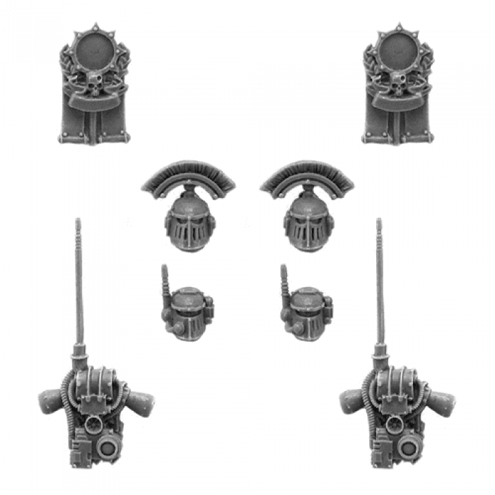 Forge world Warhammer 40K Legion MKII Command Upgrade - A set of 2 Legion Vexillas, 2 Legion Nuncio-voxs and 2 Legion Sergeant Helmets to upgrade sets of MkII Crusade Armour and Legion MkII Crusade Armour. Space Marine bodies and weapons shown in some images sold separately.