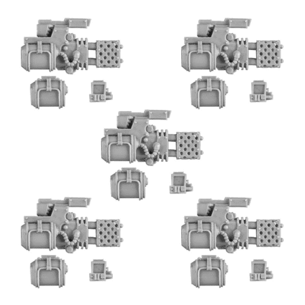 Legion Heavy Flamer Set - Heavy Flamers are often deployed by Legiones Astartes units either as area denial weapons or to force enemy infantry from fortified positions. A variety of different chemicals have been used as fuel for these fearsome weapons, all of them designed to ignite on contact with the atmosphere.This is a resin upgrade kit. It includes five resin heavy flamers, five additional ammunition packs, and an optional scanner unit. These weapons are compatible with both resin and plastic Space Marines.