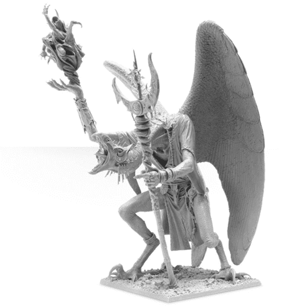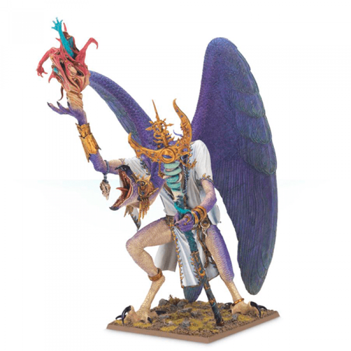 Forge world Lord of Change Greater Daemon of Tzeentch - As might be expected of a creature born of pure magic and bound to the will of the Master of Sorcery, a Lord of Change is a potent spellcaster, able to summon whirling tempests of change and mutation, blasting his enemies with bolts of multi-coloured fire. The Lord of Change is a complete resin kit that stands approximately 9.5 inches (240mm) tall to the tip of the horrors in its right hand and includes a 100mm square base. This product includes one citadel 130mm round base.