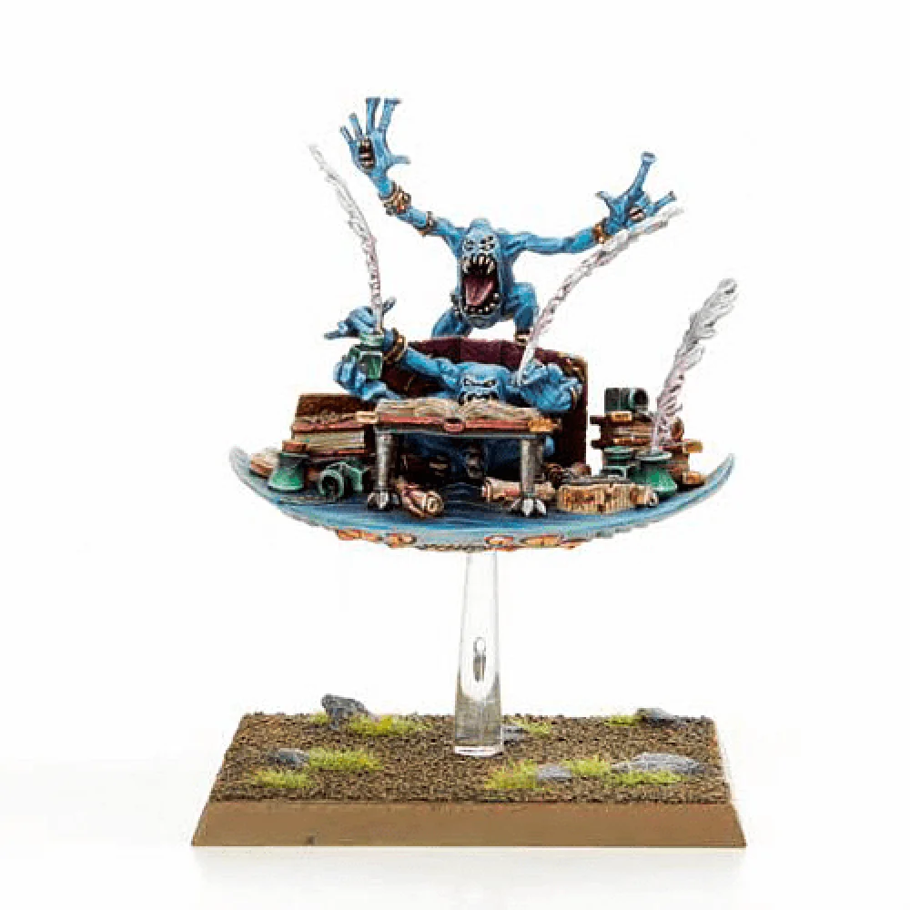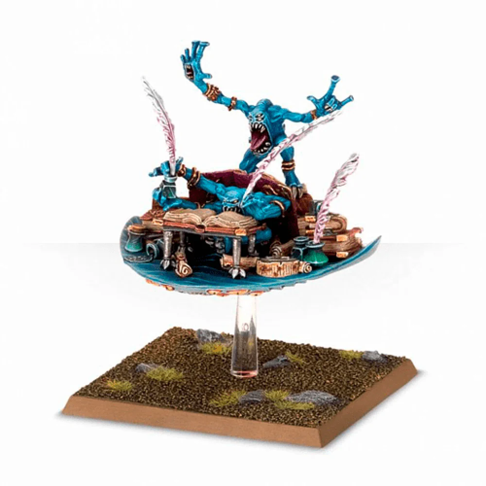 The Blue Scribes - Tzeentch created two Daemons - P'tarix and Xirat'p - which were tasked with learning every spell in existence. Though Blue Horrors in form and surly personality, the Blue Scribes are more self-aware than others of their kind. Ever careful of betrayal, Tzeentch bestowed this intelligence with care. P'tarix can transcribe the magical syllables of any spell to parchment, but cannot read. Xirat'p can read his brother's scribblings, but cannot understand them. Judging his work to be good, the Great Sorcerer sent his newest creations out into existence and bade them not to return until their quest was complete. This is a finely detailed resin cast kit, and contains 12 components, a 50mm square base, a large flying base and two long flying stems, with which to make The Blue Scribes.