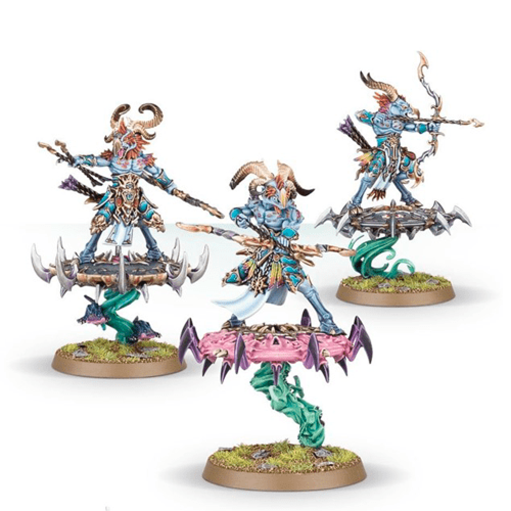 Warhammer 40k Atop weird Discs of Tzeentch the Tzaangor Skyfires soar across the battlefield into positions where they can rain death upon the foe. Able to catch glimpses of the future, the Skyfires send their Arrows of Fate on what appear to be baffling trajectories to an observer – but the missiles instead strike their targets’ most vulnerable weak spots with confounding accuracy. This multi-part resin kit contains the components necessary to assemble 3 Tzaangor Skyfires. Atop fearsome, toothed-and-horned Discs of Tzeentch, they attack with greatbows – one model can be assembled as an Aviarch, whose greatbow is more ornate, and his headpiece (from a choice of 2) even grander than the already ostentatious coverings of the other Skyfires. Included are 3 quivers, and 6 different heads enabling you to customise your models. This kit is supplied with 3 Citadel 40mm Round bases, and can optionally be used to assemble 3 Tzaangor Enlightened