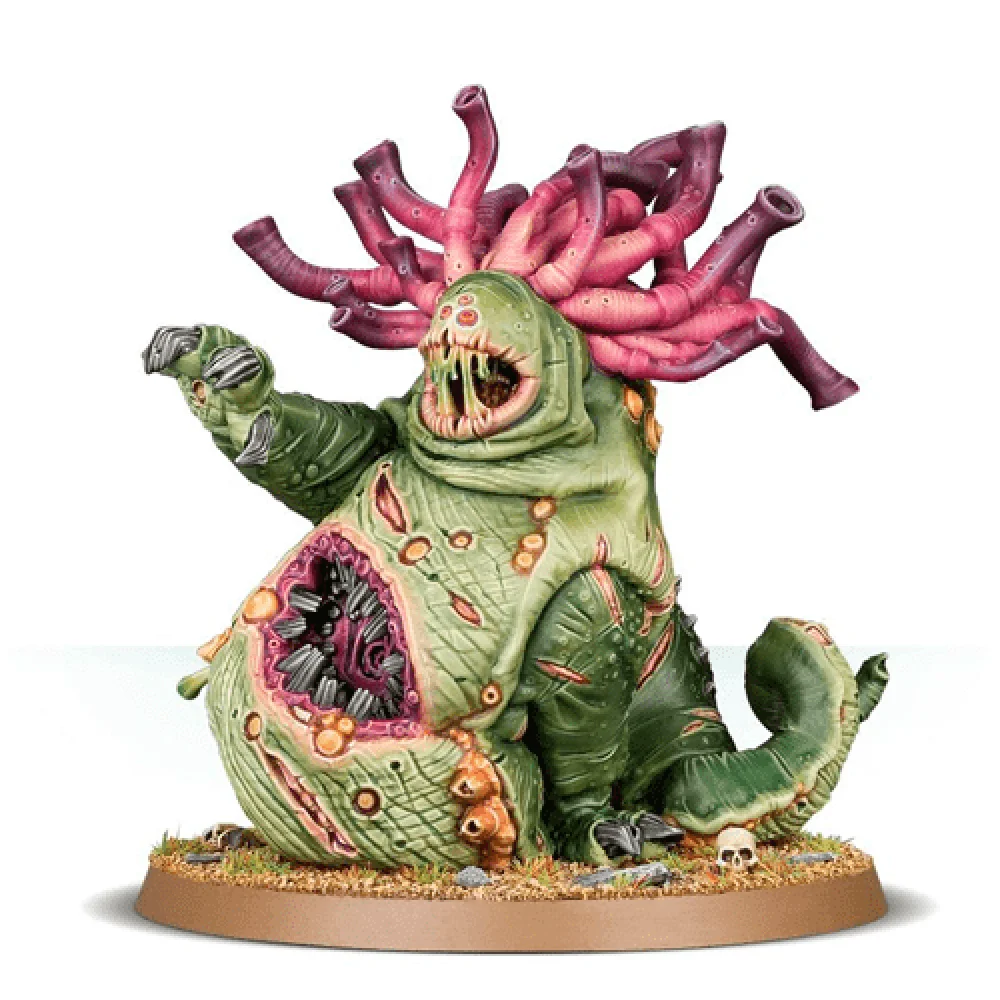 Warhammer Age of Sigmar Beast of Nurgle - Beasts of Nurgle are slug-like monstrosities whose enormous bodies are weighed down with slime-slick muscle and blubber. Fanged maws yawn wide in their flesh, and an unspeakable reek wafts from their bodies – but for all their horrifying aspect, they are friendly and enthusiastic creatures. Their minds know nothing of malice or spite, and as they squirm into battle they do not seek to slaughter the enemy but to play with them. Beasts of Nurgle are always desperate for attention, and they hunt down new playmates with rambunctious glee. This multi-part plastic kit contains the components necessary to assemble a Beast of Nurgle. He doesn’t carry weapons, rather smothering the enemy with his claws, tentacles and slobbering tongue. there are 3 options for his impressive belly, which attach to the single body assembly – 1 with a toothed maw, 1 with a few deep cuts and 1 with a large gaping wound showing a variety of internal organs. There are 2 sets of hands supplied, each featuring 1 hand reaching out with the other steadying the Beast – 1 set is webbed, and the other is clawed, with 2 similar sets of feet. 3 different faces are available, each more manic than the last – 1 featuring a single eye, 1 featuring an icon of Nurgle where the eye should be and 1 with a pair of eyes practically bursting out of the Beast’s skull. There are 2 crests of tentacles, and 2 tongues. This kit comes as 48 components, and is supplied with a Citadel 60mm Round base. Beasts of Nurgle can be added to Warhammer 40,000 and Warhammer Age of Sigmar armies.