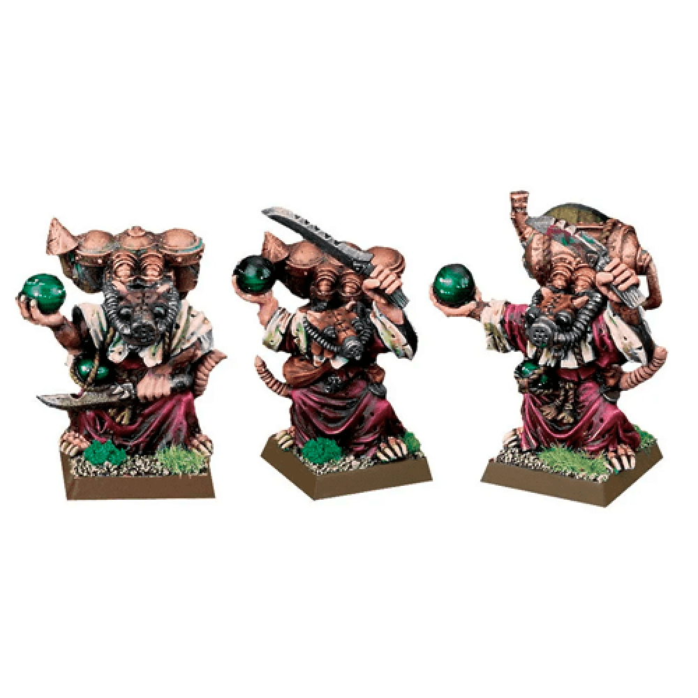 Poison Wind Globadiers - Poisoned wind globes are glass or crystal orbs filled with deadly warpstone gas. When thrown, the sphere shatters, releasing billowing clouds so lethal that mere skin contact can cause severe pain or even death. On the battlefield Poisoned Wind Globadiers lurk between Skaven formations and await an opportunity to dart forward and lob their deadly missiles. This contains three resin Poison Wind Globadier. There are three different Globadiers available and this may contain any one variant. Models supplied with a 20mm square bases.