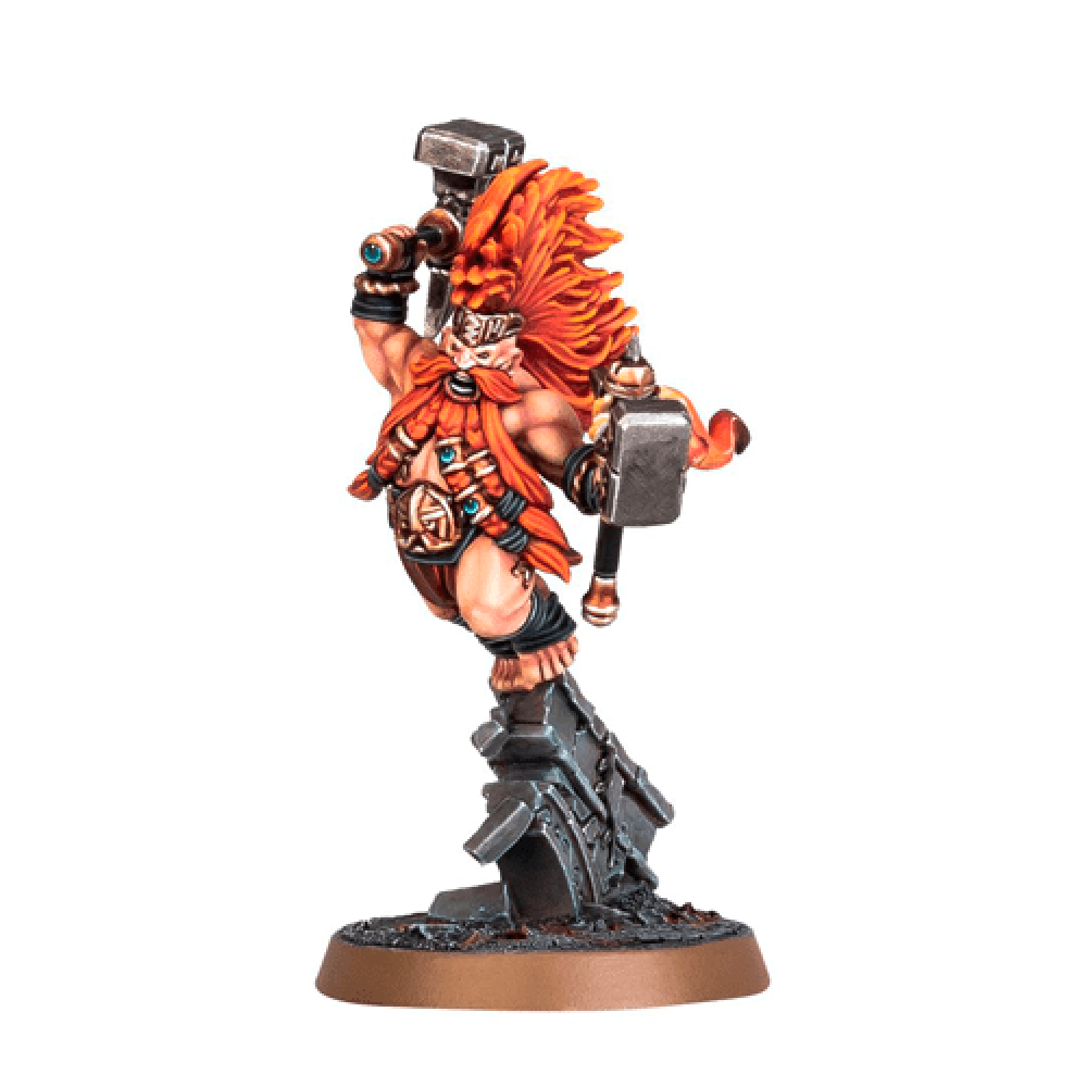 Grimhold Exile - Wielding paired fyre-rune hammers, Grimhold Exiles are the survivors of fallen magmaholds, warriors who fight to honour their lost kin with each blazing strike. This multipart kit builds a Grimhold Exile, a potent hero for your Fyreslayer army. He's an ideal front-line support unit, eager to get stuck in with his flaming hammers as he brings honour to Grimnir.