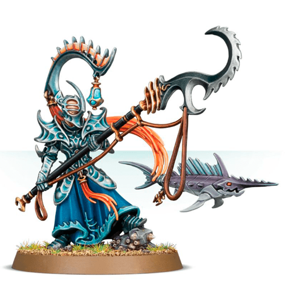 Warhammer Age of Sigmar Isharann Soulrender - The Soulrenders are unusual amongst the Isharann, for they are trained alongside the Akhelians, and are well accustomed to acting at the forefront of battle. Upon each Soulrender’s helm dangles a lurelight, its strange glow attracting and absorbing souls. Armed with a hooked polearm known as a talúnhook, Soulrenders fight alongside the Namarti, replenishing their subordinates’ ranks even as they reap spirit-stuff. A rope-catch attached to the talúnhook is ideal for snaring foes that attempt to flee, and each Soulrender employs a Rakerdart, a bond-beast that glides at its master’s feet, ready to stab prey with its sharp bill to ensure none can escape. This multi-part plastic kit contains the components necessary to assemble an Isharann Soulrender. Far more heavily armoured than the Namarti he fights alongside, this model is clad in thick metal plate, with enormous shoulder pads in the shape of nets giving the model a particularly aggressive silhouette. The lower half is covered by a large robe featuring embroidered waves, from under which his heavy boots peek – his left foot is standing on a barnacle-encrusted rock, which decorates the base. His helmet is a standout feature – partially closed, a large metal structure looms out and over the top of his head, ending with the lurelight he uses to attract the soulstuff that fuels his kin. His talúnhook is massive – longer than he is tall – and ends in a wicked serrated blade, curving into an evil-looking hook, with its rope-catch dangling beneath. The Rakerdart that accompanies him is clearly a creature accustomed to combat, with plates running the length of its body and a large spike providing offensive weaponry. This kit comes as 7 components, and is supplied with a Citadel 32mm Round base.