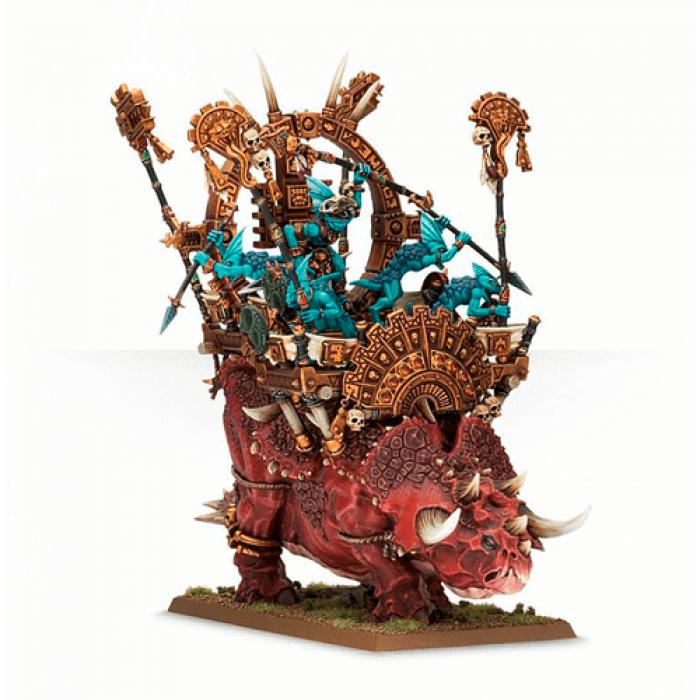 Lizardmen Stegadon - The first of these is the Engine of the Gods which sits atop the rear of the howdah. A semi-circular glyph plate can be added to the front of the howdah, whilst a Skink Priest wearing a skull mask and carrying a staff accompanies 5 Skink crew armed with javelins. There are also 2 banner poles specific to the Engine of the Gods which can be carried by the Skinks.