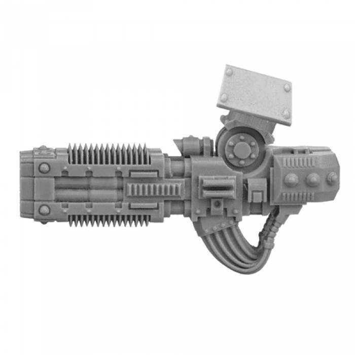Contemptor Pattern Volkite Culverin - Volkite weapons are of ancient and arcane design. Their manufacture is complex and the knowledge required to produce them is closely guarded by the Mechanicum of Mars. The Volkite Culverin is the most potent man-portable iteration of Volkite technology in use by the Legiones Astartes. Its beam has a devastating effect on organic matter, explosively burning flesh into ash and jetting fire. The Contemptor pattern Dreadnought’s powerful reactor and load bearing capacity allow it to carry a twin-linked variant of the Volkite Culverin into battle. The Contemptor pattern Volkite Culverin is compatible with Contemptor pattern Dreadnoughts. This multi-part resin kit can be constructed for use as either a left or right weapon arm.