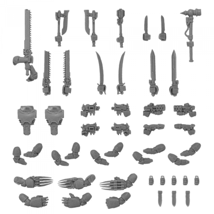 Forge world Warhammer 40K Legion MKIV Power Weapons Set - The warriors of the Legiones Astartes are the Imperium’s elite, and their officers are commonly equipped with the finest wargear imaginable. In the 41st Millennium, the Armouriums of the great Space Marine Chapters contain many war-relics, ancient weapons with histories as noble and storied as the battle-brothers that have borne them into combat. The resin MkIV Power Weapon Set contains a huge variety of weapons and equipment. The kit comprises ten melta-bombs, five pairs of arms, four Tigrus-pattern bolt pistols, three power fists, three lightning claws, two power axes, two power swords, two chainswords, two Charnabal Sabres, two combat blades, two hand-flamers, two plasma pistols, a thunder hammer, a power maul, a heavy chainsword as well as two modified MKIV torsos. This cornucopia of wargear is perfect for use with our range of resin Space Marine Infantry, and is also fully compatible with Games Workshop’s plastic kits. Space Marines and accessories shown in some images sold separately. The Legion MKIVDespoiler Squad shown in some images for illustrative purposes only and is sold seperately.