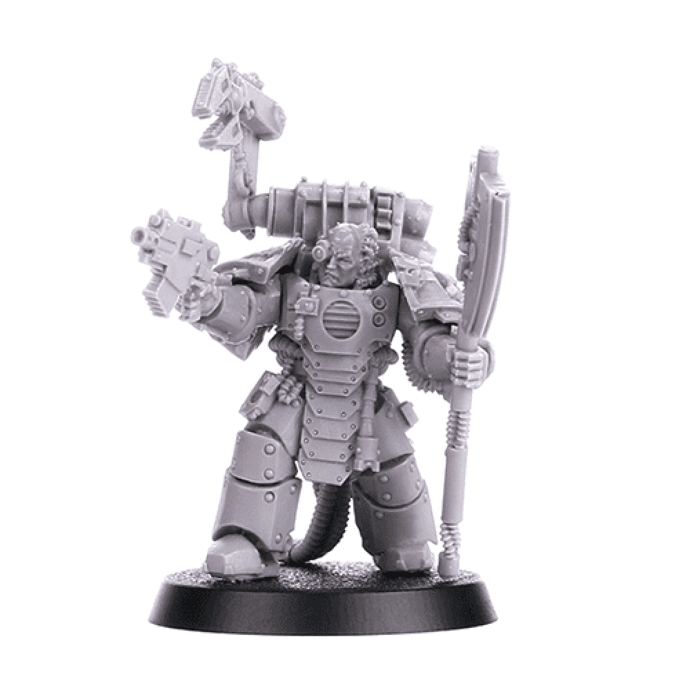Forge world Warhammer 40K Techmarine in Mk III Armour - Specialists in the technological needs of their Legion, Techmarines are trained in the rites and secrets of the Mechanicum. They tread a fine line of loyalty between Legion and the Machine Cult of Mars but their duty comes above all other concerns, tasked as they are with overseeing the maintenance and manufacture of their Legions arsenal. Techmarines are often found in the heart of battle, repairing damaged vehicles and incanting words of supplication to beleaguered machine-spirits. This Mk III Techmarine is armed with a servo-arm, power axe and bolt pistol. He wears modified MK III power armour. Rules for using Techmarines in Horus Heresy Games can be found in the Legiones Astartes Crusade Army List. This is a complete, multi-part resin model supplied with a 32mm round base.