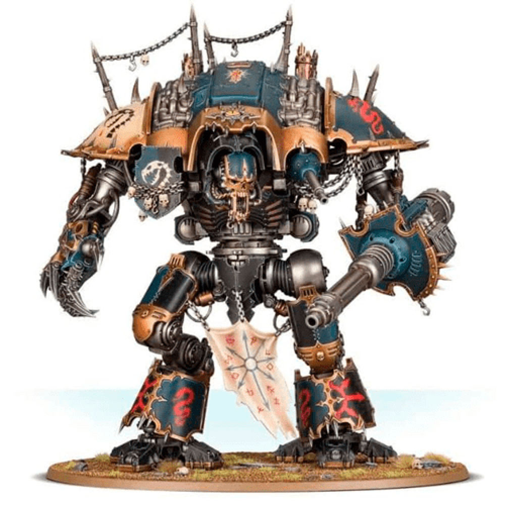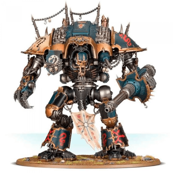 Chaos Knights - Knights Desecrator spare no living thing from their attacks. They possess potent long and close range armaments, allowing them to cut down enemy war engines and monstrous beasts at great distances, or annihilate hordes of lesser foes that swarm around them. They are also cruel taskmasters, snarling commands to the War Dog followers that lope forward at their sides.