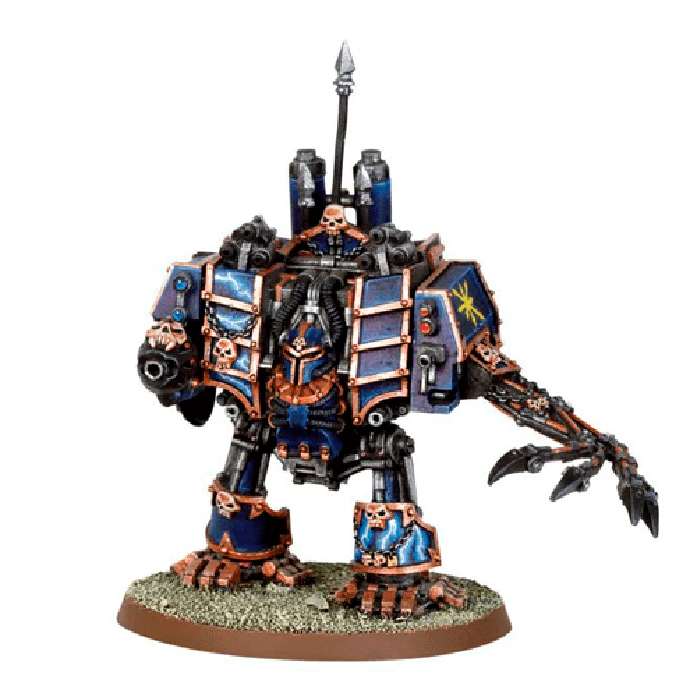 Chaos Dreadnought - It is a heavily armored, bipedal walker armed with powerful weaponry, including ranged guns and close combat weapons. Piloted by a Chaos Space Marine interred within its sarcophagus, the Dreadnought is a fearsome sight on the battlefield, capable of wreaking havoc upon enemy forces.