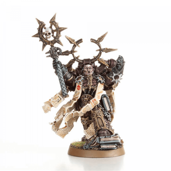 Dark Apostle - Dark Apostles make up the priesthood of the Dark Gods. Just as the Chaplains of the loyalist Space Marines uphold the creeds of their Chapters, the Dark Apostles devote their lives to the propagation of the unholy word, actively spreading the worship of Chaos across the galaxy. The Dark Apostle shows off the incredible detail of our premium Citadel Finecast resin. With one foot atop a pile of books, he raises his defiled crozius arcanum to the sky as trails of parchment, affixed to his armour by 8-pointed stars, swirl to one side.