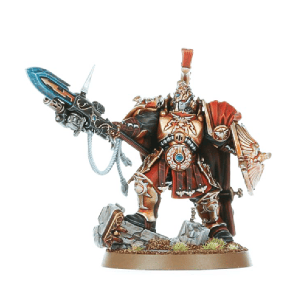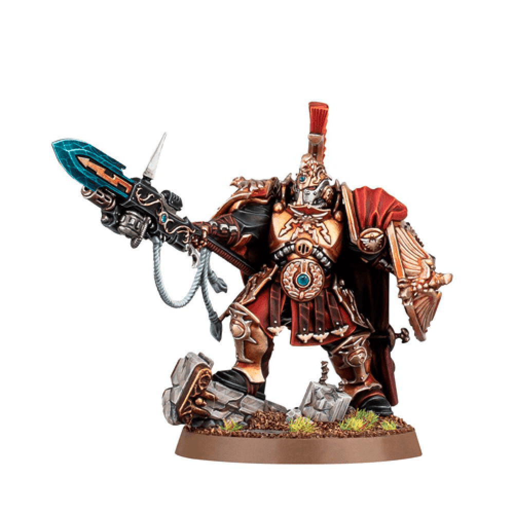 Shield-Captain - Shield‑Captains are among the greatest warriors in the Imperium. No matter which weapons they wield, they display absolute mastery of them. Their tactical and strategic abilities are superlative, and they read the ebb and flow of a war at a glance before directing their forces accordingly. This kit contains 21 components, and a 40mm Round base.