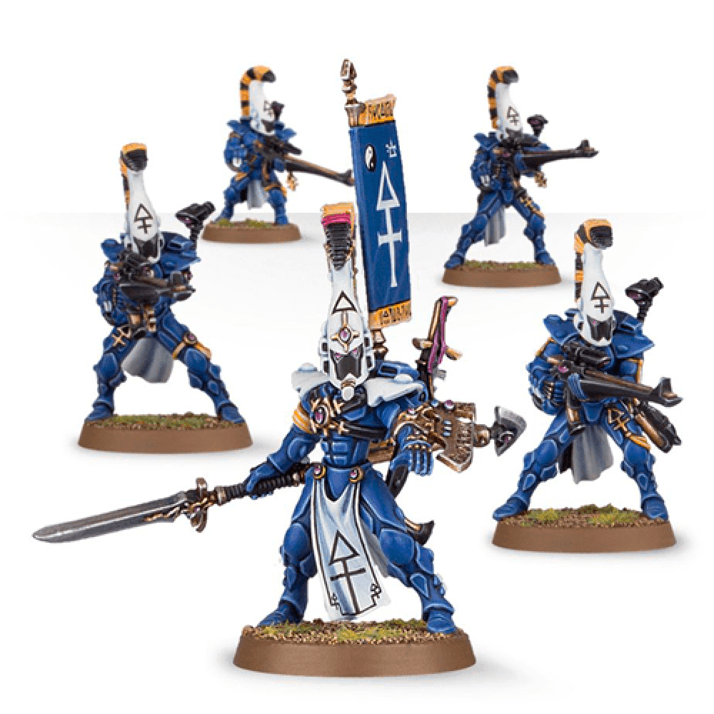 Dire Avengers - The Dire Avengers are first amongst the Aspect Warriors of the Eldar. They represent the War God’s unending thirst for vengeance upon a galaxy of woe, and as such they are merciless to their foes and unstinting in their devotion to their people. The Dire Avengers in this kit are all armed with Avenger shuriken catapults, as well an enough extra parts for each to be equipped with their own ammunition pouches. There are optional parts to make an Exarch who can be armed with a shuriken catapult, two shuriken catapults, a diresword and a shuriken pistol, or a power weapon and shimmershield. Also included is a choice of two Exarch heads (1 helmeted, the other bare) and an optional back banner to further distinguish the unit’s leader. As well as this, there is a small statue of Asurmen included on the frame. This multi-part resin kit contains 42 components and to make five Eldar Dire Avengers, or four Dire Avengers and one Dire Avenger Exarch. Add more boxes to your cart to build up a bigger core of infantry for your collection.