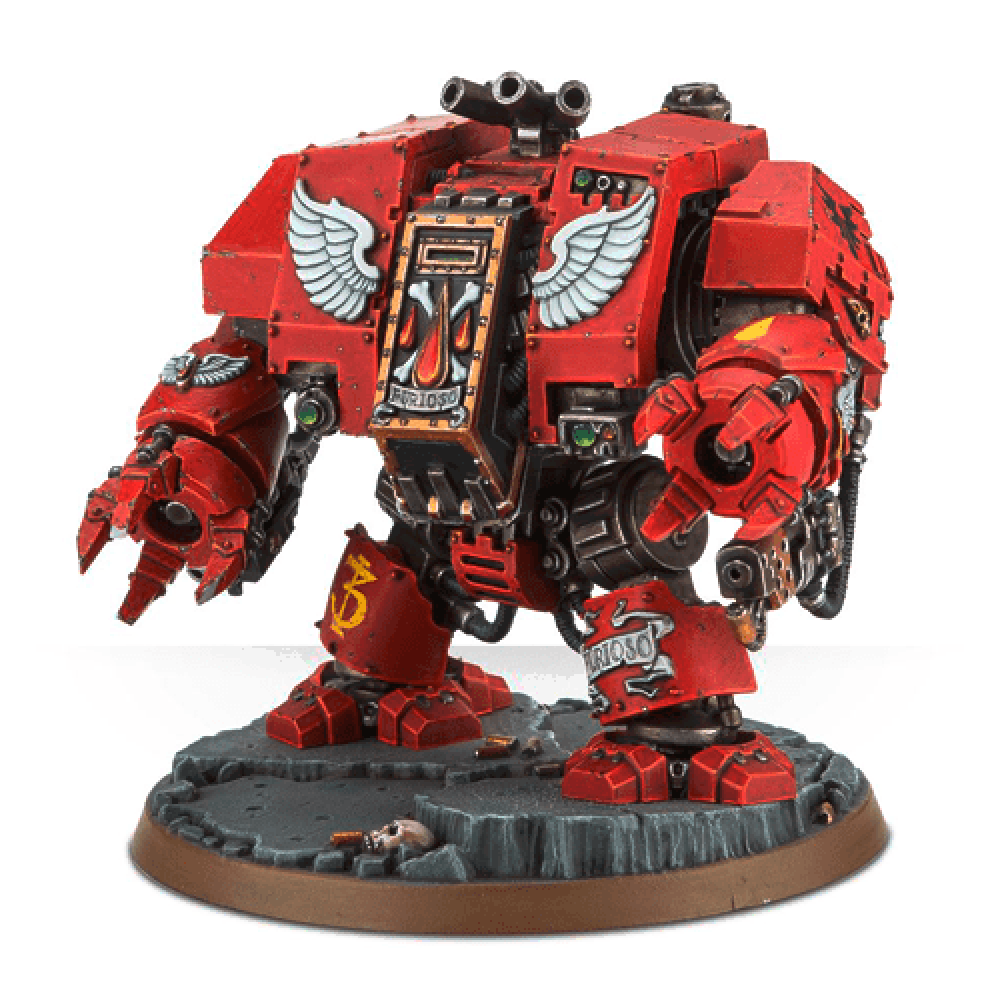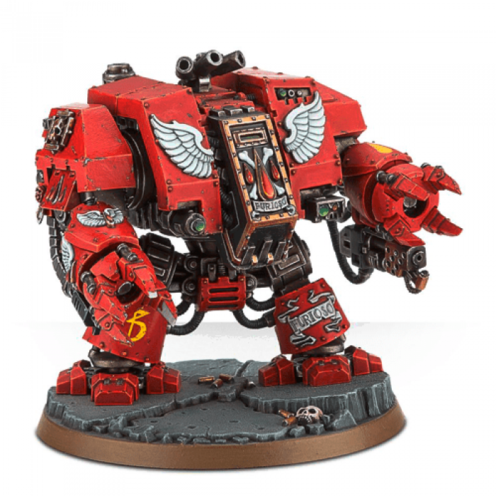 Blood Angels Furioso Dreadnought - The Furioso Dreadnought is death incarnate, a towering war machine whose fearsome weaponry is guided by a pilot buried deep within its shell. Many bear the scars from thousands of years of warfare and they are revered within the Blood Angels Chapter as living relics. Some Furioso Dreadnoughts are guided by the crippled and ancient body of a Blood Angels Librarian, whilst others have succumbed to the Black Rage and now fight alongside the Death Company, intent on destruction and death.