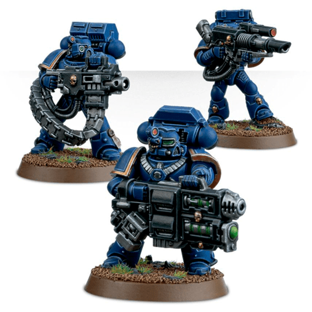 Space Marine Devastator Squad - Support troops who truly live up to their name, the Space Marine Devastators deliver the Emperor’s judgment via stunning displays of brutal firepower. Missiles slam into ranks of enemies, blasts of scorching plasma melt craters into the very earth, lascannons punch through the hardest defences and the droning hum of grav-cannons rises to a terrible crescendo as the target of the Devastators’ wrath is reduced to nothing more than memory and dust. This multi-part resin kit contains everything you need to build five Space Marine Devastators, one of which can be optionally assembled as a Space Marine Devastator Sergeant, with three Sergeant heads included. The poses these models can be assembled in are classic Devastator poses, with targeter helmets and castellated greaves designed to counter the immense recoil thrown out by their heavy weapons. Also supplied are five 32mm Citadel Round Bases.