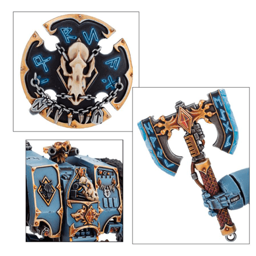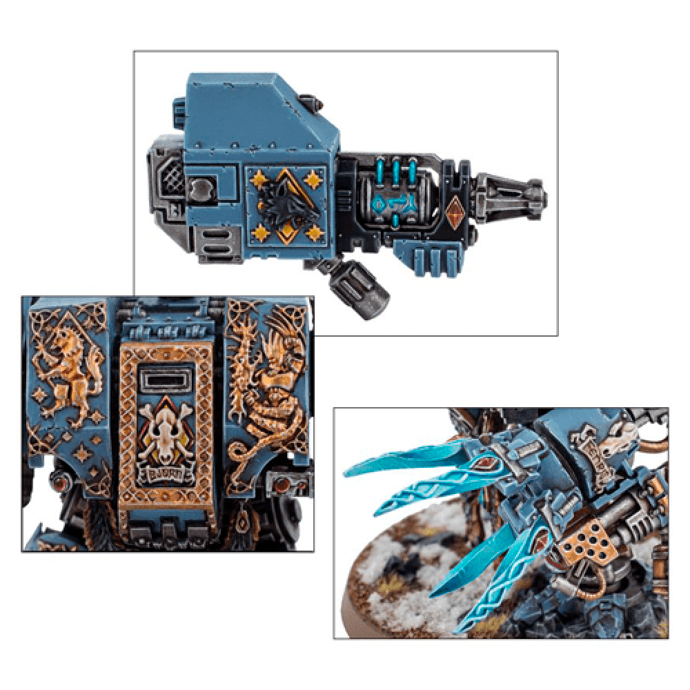 Warhammer 40K Space Wolves Venerable / Murderfang Dreadnought - Venerable Dreadnought / Murderfang Dreadnought \ Bjorn the Fell-Handed Dreadnought - A towering construct of man and machine, the Space Wolves Venerable Dreadnought is a walking colossus of adamantium and ceramite. Within the talisman-covered sarcophagus lies the remains of an honoured hero of the Chaper, broken in body but not in mind. These warriors have taken to the field of battle in the name of Russ for thousands of years, their wisdom as deep as the ocean and their intuition as sharp as a kraken’s teeth. They are the Allfather’s vengeance made manifest. This multi-part plastic kit makes one Space Wolves Venerable Dreadnought armed with a Fenrisian great axe and blizzard shield. It comes with a selection of additional weaponry, including a helfrost cannon and a multi-melta. This kit can also be assembled as Bjorn the Fell-Handed or Murderfang.