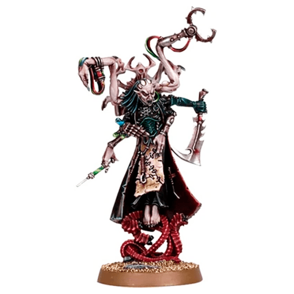Urien Rakarth - Urien Rakarth is the most ingenious of the many Haemonculi masters, a flesh-sculptor of incomparable skill and depravity. He is the Sculptor of Torments, whose repugnant creations strain the sanity of enemies and allies alike. Once his casket of fanged spirits and his toxin-laced blades have done their grisly work, a coiling nest of Haemovore familiars feasts upon whatever is left of Rakarth’s foes. This set comprises 8 resin components, and comes with a 25mm Round Slotted Base.