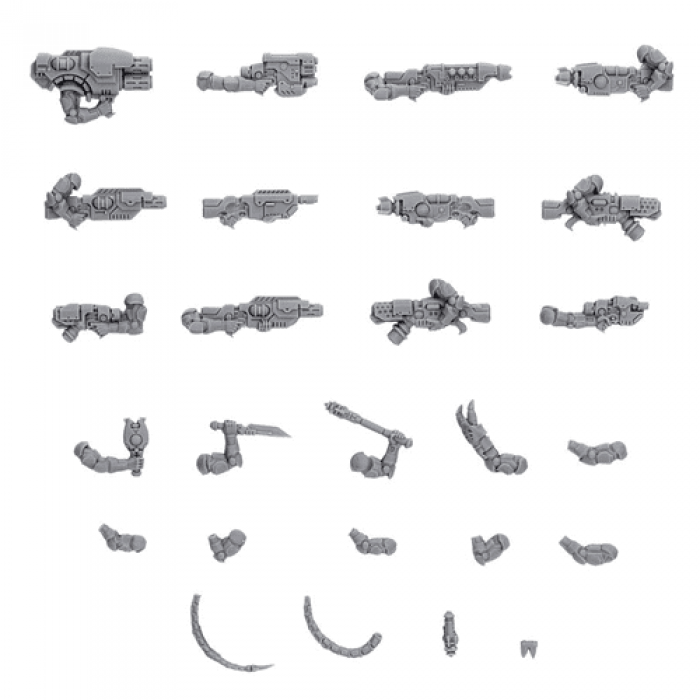 Van Saar Weapons Set 2 - House Van Saar is the technological powerhouse of Necromunda, its artisans and armourers creating the finest weapons and wargear of all the clans. Their staggering power, however, is built around a dark secret – flaws in their understanding of technology that bathe them in radiation and slowly kill them from within. This resin kit contains the parts needed to upgrade a plastic Van Saar gang. Included: A power knife; A servo claw; A shock baton; A hand flamer; A las sub-carbine; A combi-plasmagun A flamer; A gravgun; 2 rad guns; 2 meltaguns; A lasgun; A shockstave.