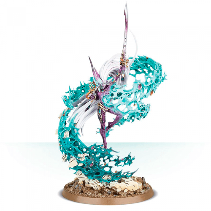 The Yncarne, Avatar of Ynnead, wreathed in a roaring psychic hurricane, invigorating the spirits of the Aeldari around them, the Yncarne comes armed with Vilith-zhar, the Sword of Souls which can take many forms – this miniature includes a sword and a pair of daggers.