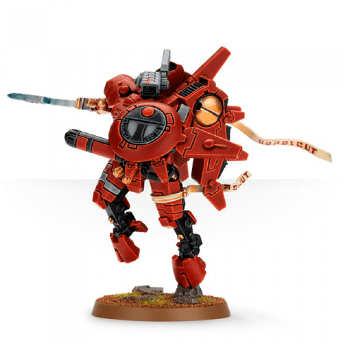 Warhammer 40K Commander Farsight - There is no figure in Tau history as divisive as Commander O’Shovah. The most famous warrior of Vior’la, Farsight’s greatest victories were against the Orks on the oxide-desserts of Arkunahsa. It was his tactical brilliance that earned O’Shovah his famous title Farsight. This exceptionally detailed Commander Farsight model comes in an extremely dynamic pose. Wearing a Crisis battlesuit and armed with a plasma rifle, he stands with one leg raised, his circular shield generator lifted on his left arm, and with his Dawn Blade out to his right. There are flowing strips of material on his thigh and back from the Dawn Blade to add to the sense of rapid movement. Though he bears the symbol of the Fire caste on his armour, he bears his own insignia on his shield generator, crisp in the detail of Citadel Finecast. This finely detailed resin kit contains 14 components with which to make Commander Farsight.