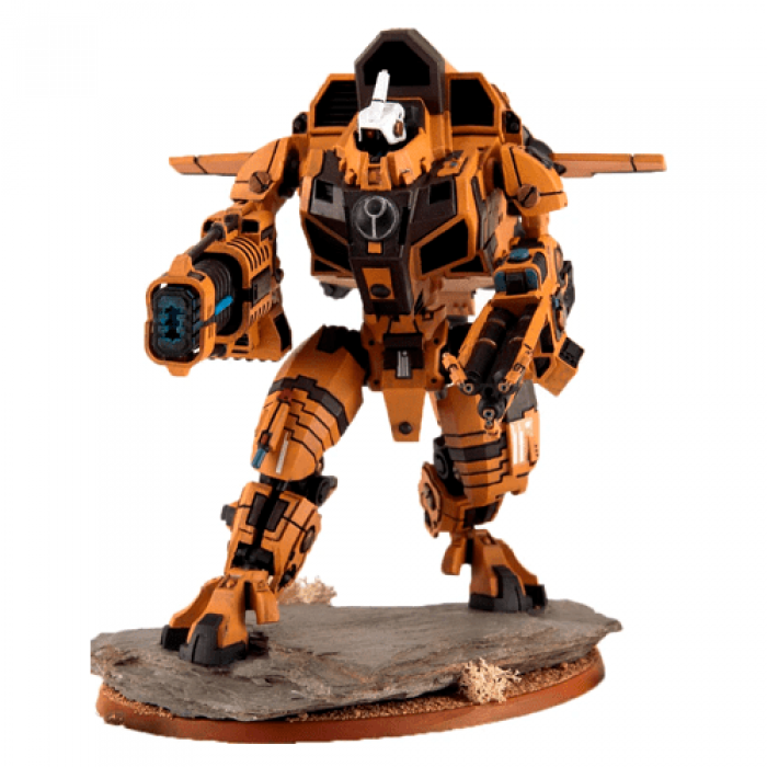 XV109 Y'Vahra Battlesuit - Rushed into deployment after the success of the R'varna battlesuit, the XV109 Y'vahra is a Class 10 battlesuit designed for devastating shock assault. To facilitate this role, the Y'vahra is equipped with a triple barrelled phased-plasma flamer capable of vaporising even hardened ceramite, and a massive EMP discharge cannon designed to incapacitate enemy war engines. The complex vectored thruster array incorporated into the Y'vahra's impressive armour allows it to traverse the battlefield in long graceful bounds, slamming into the greatest concentration of the enemy and reaping a heavy toll in lives before jetting away. The Y'vahra battlesuit originates with the same Earth caste engineer as the R'varna, Fio'O Ke'lshan Sho'Aun, infamous for his resistance to the will of the Ethereal Council as much as his genius at weapons design. The Y'vahra represents a disturbing paradigm shift in the tactics of the pragmatic Ke'lshan Sept, in whom long years under near constant attack by alien forces has bred a stubborn pragmatism and siege mentality. The new XV109 is clearly a design intended to carry the fighting to the enemies of the Ke'lshan, perhaps marking a new stage of expansion on the Tau Empire's neglected eastern border. Complete multi-part resin kit.
