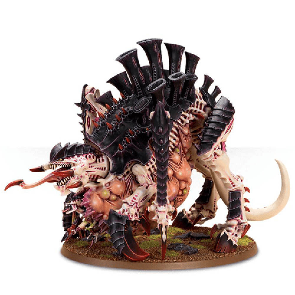 Tyrannofex / Tervigon - The Tervigon is a massive, living incubator, beneath whose lumpen carapace dozens upon dozens of Termagants slumber in a state of near-life – and it can spawn its dormant broods at will. The Tervigon displays all the horrific might so typical of the Tyranids, and is a suitably stomach-churning addition to a Tyranid collection. Standing on four limbs, two of which are hoofed, the other two being barbed and arrow-sharp, it features an outer carapace with chimneys, and a long, segmented chitinous tail. Its underside is no less hideous as it comes caked with ichor and is bubbling up as Termagants spawn from its distorted flesh.