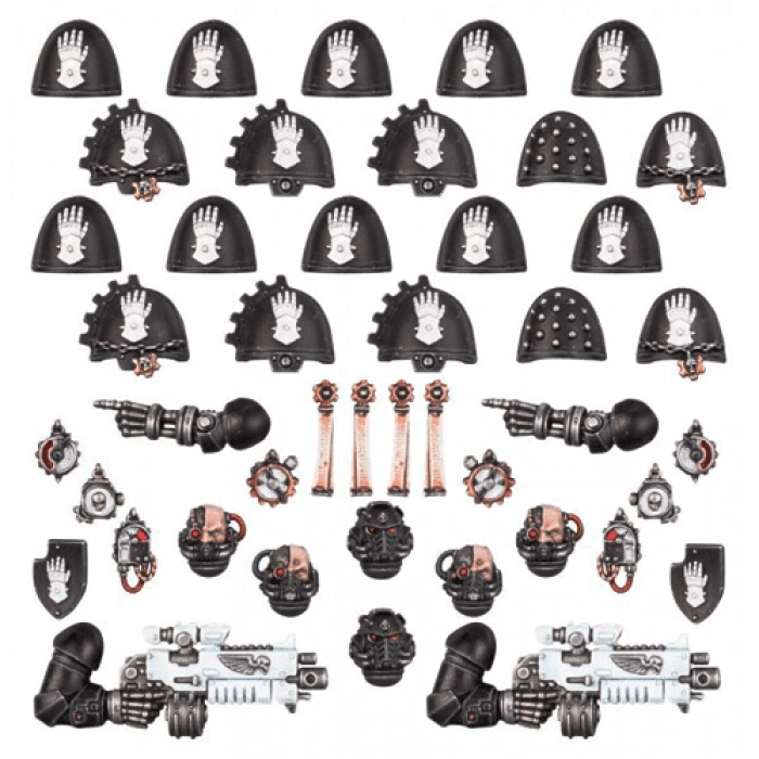 - 5x Iron Hands MK X power armour shoulder pads (designed for use with Hellblasters/Intercessors)