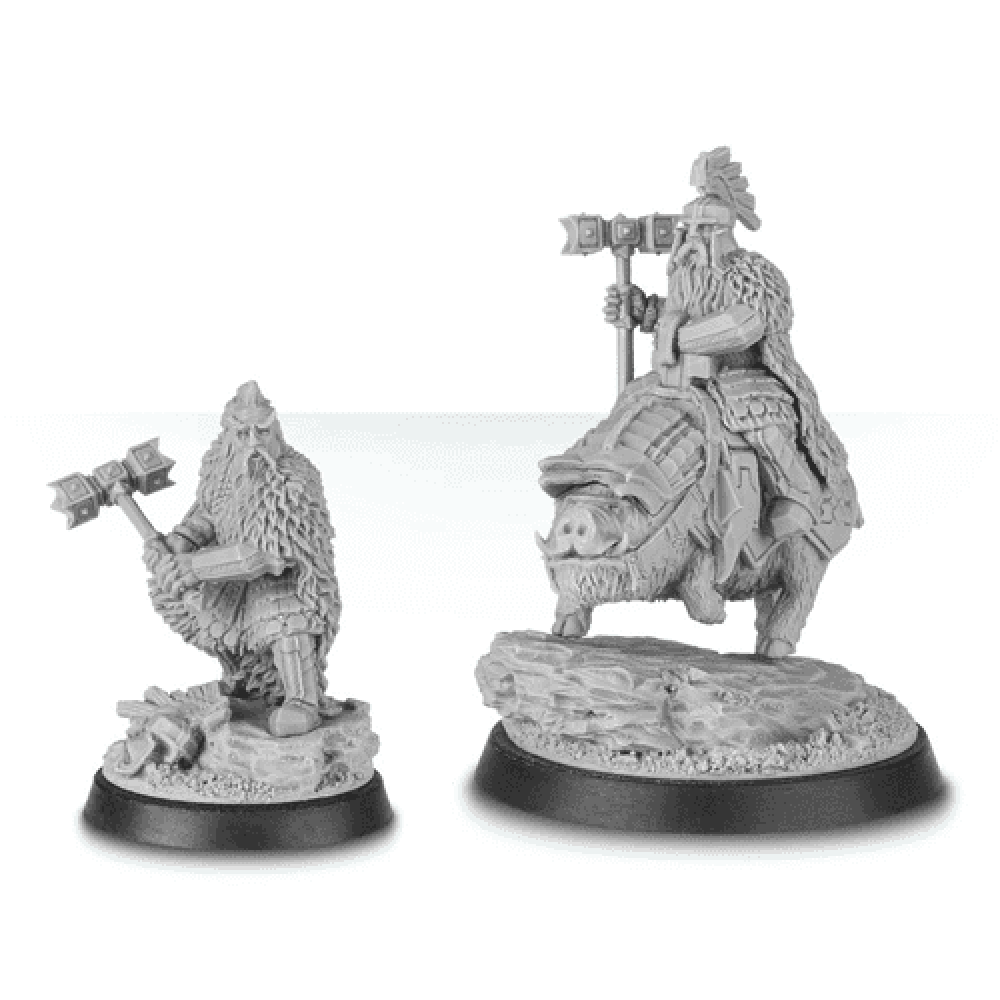 Dain Ironfoot: Lord of the Iron Hills - Dain Ironfoot is the cousin to Thorin Oakenshield and the lord of the Dwarven stronghold in the Iron Hills. A stubborn and hotheaded warlord, Dain is quick to anger even at the cost of wisdom. Yet what Dain lacks in tact, he more than makes up for with his martial prowess. There are few who can stand against this mighty Dwarven lord and those who try will often be felled by a vicious swing of his massive hammer. In the Strategy Battle Game, Dain Ironfoot is both a fearsome warrior and an excellent leader, ideal for commanding your ranks of Iron Hills Dwarves in battle. This kit comes with two versions of Dain, one mounted upon his iconic war boar and one on foot incase he should become dismounted during the game. Dain is one of the best fighters available to the forces of Good. Incredibly tough and strong, he can effortlessly wield his great two-handed hammer, crushing the skulls of his enemies with terrifying ease. Upon his war boar Dain is capable of smashing through ranks of enemies, leaving untold devastation in his wake. Even on foot Dain is a formidable opponent, using his own thick skull as a weapon should the need arise. Powerful though he is, perhaps his greatest strength is the courage he inspires in his army. The sight of this mighty Dwarven lord upon the battlefield drives his followers onwards to deeds of great valour, braving any threat they find themselves facing. This highly detailed, multi-part resin kit makes two models: Dain Ironfoot on foot and Dain Ironfoot mounted on his War Boar. Each model wears heavy Dwarf armour and wields a two-handed hammer. A 40mm round base and a 25mm round base are included.