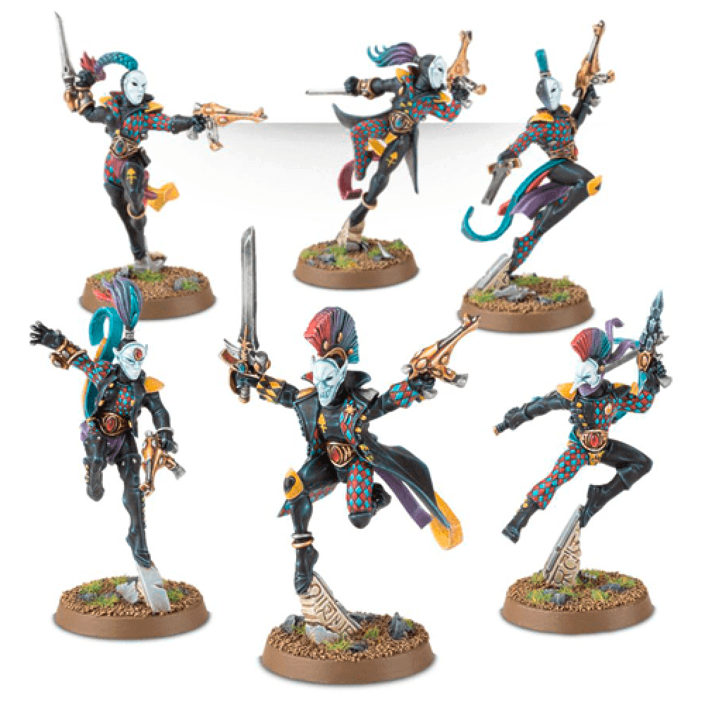 Harlequin Troupe - In battle, Harlequin Troupes move fast and hit hard, relying on speed and skill to annihilate the enemy before they even have time to raise their guns. Once in combat, the Harlequins are in their element, performing a lethal dance of death while their masks shimmer with their foe’s worst fears.