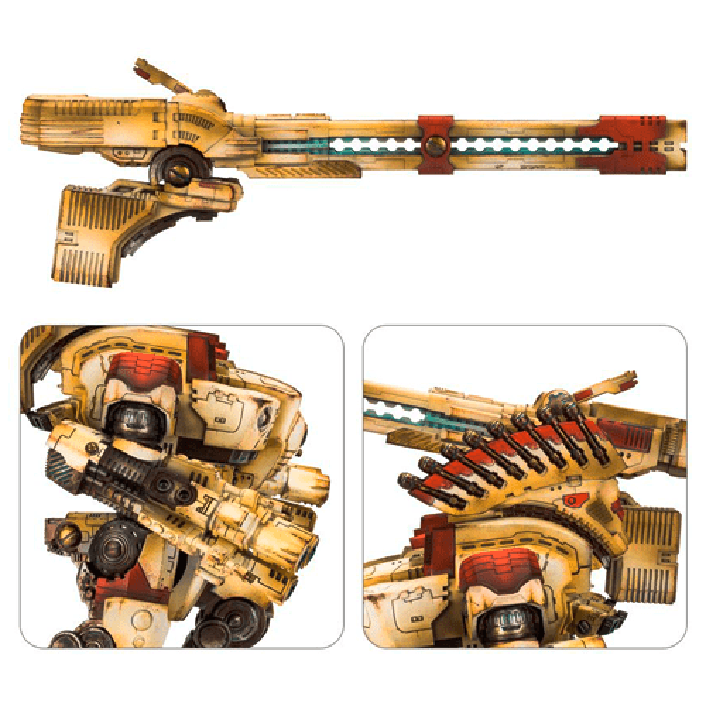KX139 Ta’unar Supremacy Armour with Heavy Rail Cannon Array - Equipped to devastate heavily armoured targets at extreme range, whilst crushing infantry units at close quarters, the Tau KX139 Ta’unar Supremacy Armour is exceptionally destructive when armed with the Heavy Rail Cannon Array. Supremacy Armour was designed to eliminate the increasing numbers of enemy heavy assault elements encountered by the Tau Empire, from Imperial Knights to the towering alien monstrosities of the Tyranid Hive Fleets, and in this configuration it is extraordinarily capable of fulfilling that mission profile. This bundle includes one Tau KX139 Ta’unar Supremacy Armour Body, two Tri-axis Ion Cannon and one Heavy Rail Cannon Array. These multi-part resin kits together build a fully armed Tau KX139 Ta’unar Supremacy Armour Battlesuit including a 160mm round base.