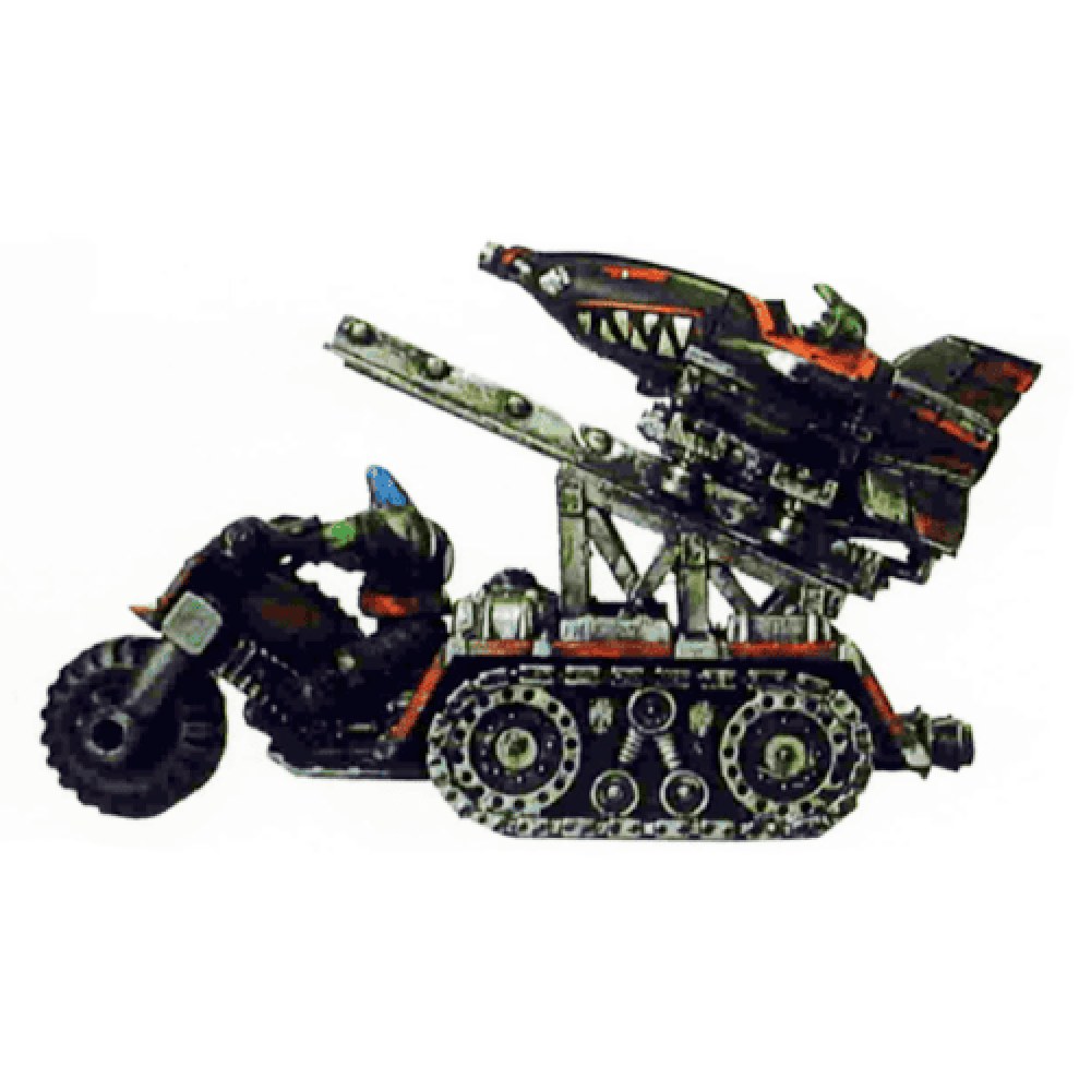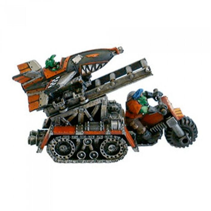Ork Grot Bomb Launcha - The Ork Grot Bomb Launcha is a weapon commonly utilized by the Ork Gretchins, known as Grots. It's a crude yet effective artillery piece that Grots use to lob explosives at their enemies. This weapon is often seen in the hands of these smaller Orkoids as a means of supporting their larger Ork counterparts in battles within the universe.
