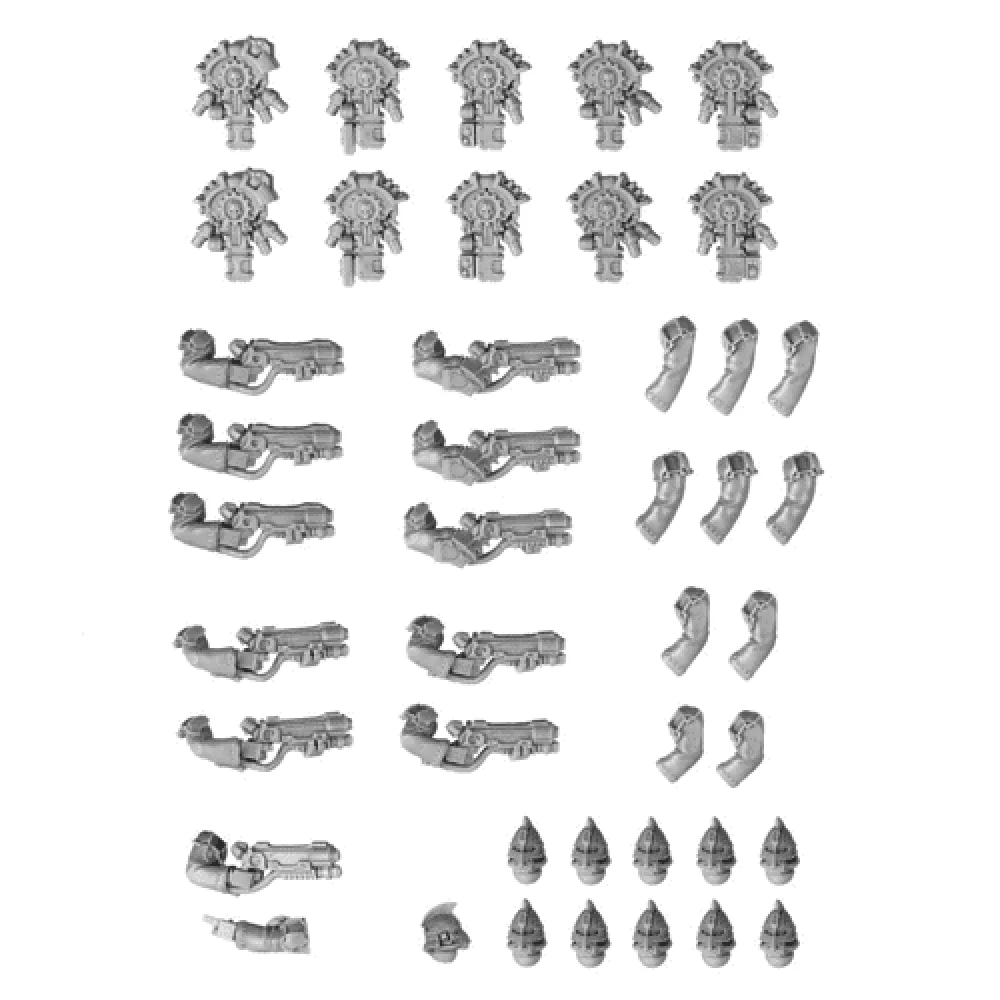 Forge world Secutarii Peltasts Upgrade Set - Developed in the lost and ancient days long before the Imperium, the Secutarii Titan Guard were created as the honour guard and protectors of the Titan Legions. For while a Battle Titan might shatter a mighty fortress or blast a tank company to ruin, it is the role of the Secutarii to eradicate such threats its survivors might still pose as the Titans press on to more important targets, and to hunt down and slay those who seek to flee from the Machine God’s wrath. Secutarii Peltasts seek targets of flesh and bone that would attempt harm on the great God-Machines of the Legio Titanicus. Armed with a Galvanic-caster, the Secutarii Peltasts are equipped for all manner of targets. This electro-galvanically driven, multi-function projectile launcher has multiple firing modes that may fire rapid bursts of low velocity, razor-edged metallic flechettes; attack concealed targets with retina-burning ignis charges; fire an armour-piercing inert slug-shot at supersonic velocities; or even fire a barrage of blind canister shot to confuse and disorientate the enemy. The Secutarii Peltasts upgrade set is a 43 piece resin upgrade kit which includes all of the parts needed to upgrade a unit of ten Adeptus Mechanicus Skitarii to Secutarii Peltasts. An alternative head and pair of arms are also included to make one Secutarii Peltast Alpha. Completed models shown built using the Adeptus Mechanicus Skitarii, available separately.