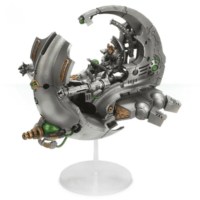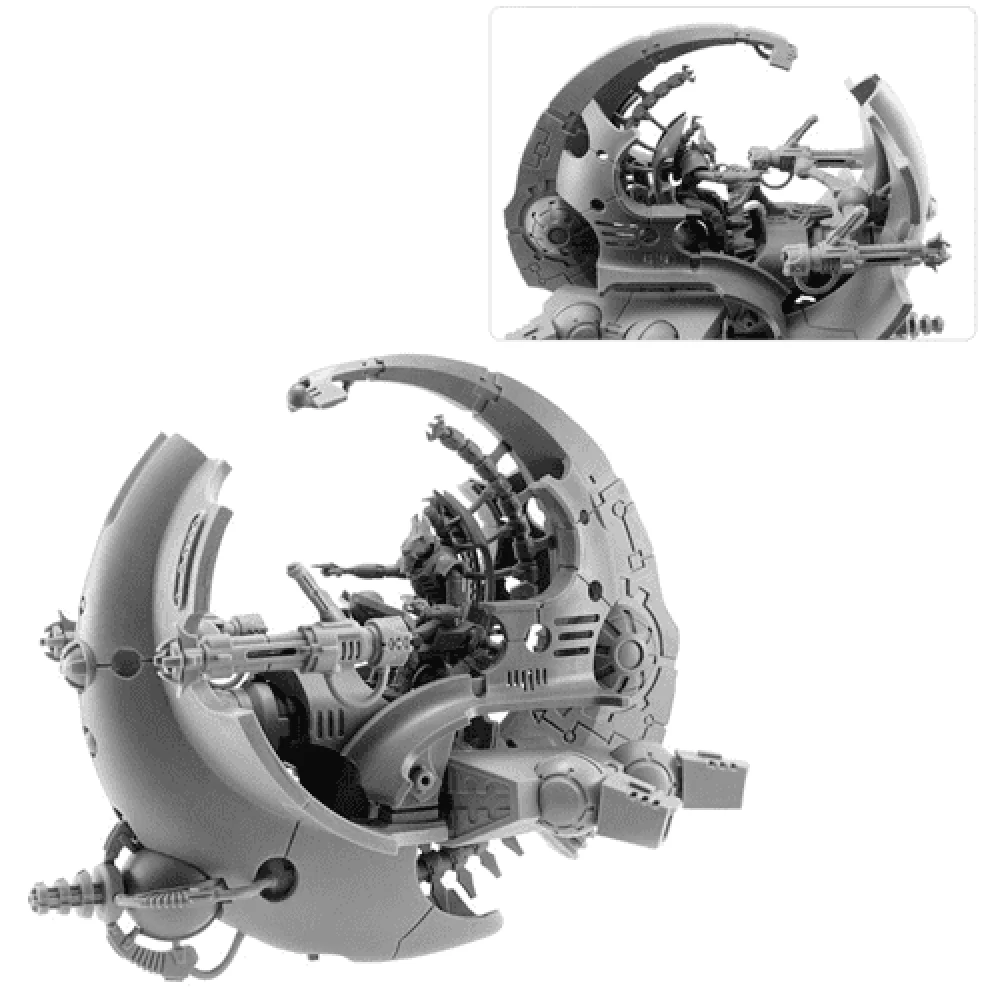 Necron Tesseract Ark - The Tesseract Ark is one of the most powerful Necron war machines encountered on the battlefields of the 41st Millennium, and so sophisticated is its design, it can be manufactured only by the most adept of Crypteks. Built around a contained singularity torn from the heart of a dying star, in battle the Tesseract Ark can siphon the destructive energies of this captured star-fragment and unleash them in a variety of terrible ways. Most notably, the armoured bulk of the Tesseract Ark is surrounded by a gravitic distortion effect, a potent defensive mechanism. The Tesseract Ark is a complete multi-part resin and plastic kit, packed with detail. The forward armour and arcane projector array of its singularity chamber give it a unique profile, making a fantastic and menacing centrepiece for a Necron army. Full rules and background for these two war machines can be found in Imperial Armour Volume Twelve: The Fall of Orpheus. Note: One of the painted Tesseract Arks shown is a pre-production model and the final model has small detail changes.